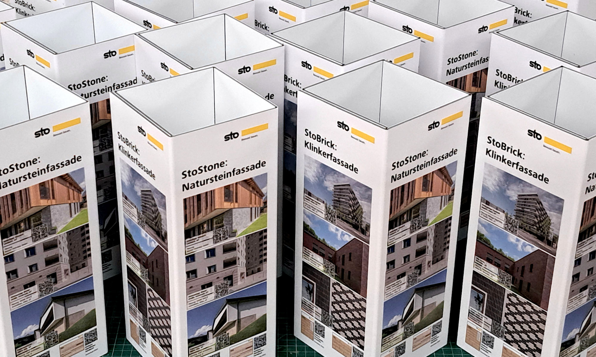 Auch die Verpackung muss was hergeben! Für die Sto-Musterteile wurden die bedruckten Boxen aus Alu-Verbund-Platten zuvor auf der 2x3Meter großen Fräse gekantet und geschnitten.